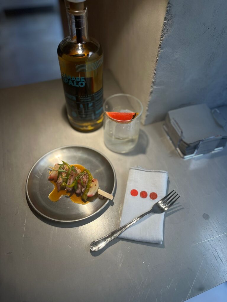 El espacio cuenta con una barra principal para 12 a 14 comensales, accesible únicamente mediante reserva, y dos puntos adicionales para quien quiera tomar un aperitivo rápido o conocer el ambiente antes de sentarse en una próxima ocasión. La propuesta gastronómica gira en torno a tres ejes: crudo, marinado y madurado. El producto es el protagonista absoluto. “Siempre me ha interesado la cocina asiática, no tanto por los sabores sino por la manera en que muestran el producto y lo respetan”, explica. Su idea es ofrecer platos donde el acompañamiento sea mínimo, solo lo necesario para realzar el sabor natural. “Cuando un producto es bueno, no necesita disfraz. Se defiende solo”, afirma.