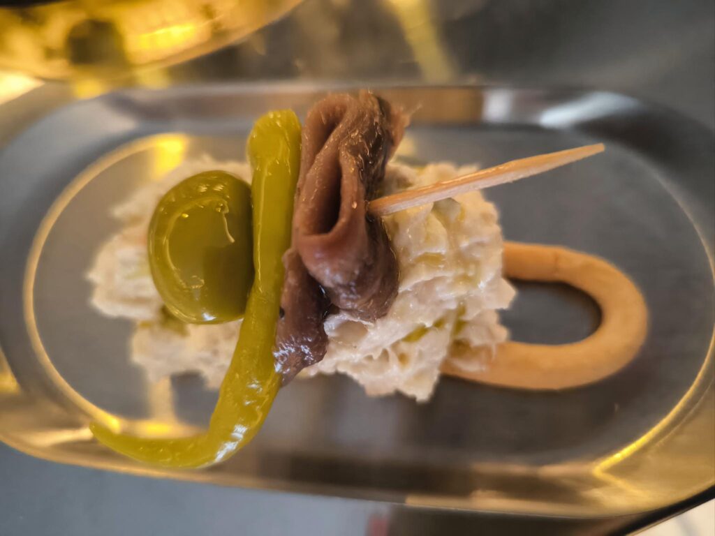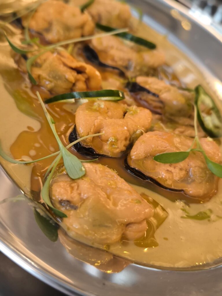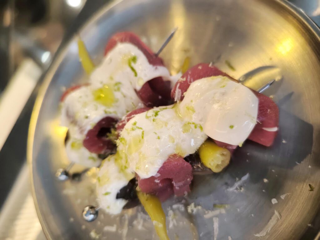 Uno de sus ejemplos más representativos es la ventresca curada, que define como “jamón de mar”. Suave, con una textura limpia y un punto salino que se equilibra con el dulzor del higo fresco. También el mejillón, tratado como pieza principal, sin salsas que tapen su sabor. En su carta, el hilo conductor es siempre el respeto al origen, con rotación constante según el mercado: hoy puede haber atún o quisquilla, mañana navajas o percebes, pero la base del formato —producto crudo, marinado o madurado— se mantiene.