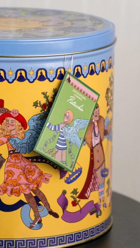 El cuidado del detalle se extiende también al exterior. El packaging, diseñado por el pintor lorquino Ricardo Martínez, convierte cada panettone en una pieza casi coleccionable. Latas ilustradas con personajes de estética contemporánea y guiños al mundo de la moda. “Estamos enamoradas del packaging. Es casi una obra de arte”, reconoce.